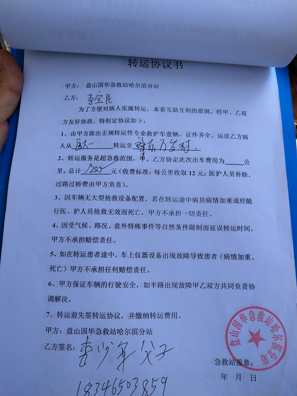 記者詢問了其中一名駕駛員車輛的相關(guān)手續(xù)和單位的資質(zhì),對方表示不清楚,他們只是司機(jī),負(fù)責(zé)開車,一個月工資3000元錢,公司指派去哪接人送到哪,他們就按照指示去做。記者又問到:你們是怎么收費(fèi)的?最遠(yuǎn)去到哪?車上有沒有醫(yī)護(hù)人員?對方說最遠(yuǎn)就是呼蘭,沒出過哈市,收費(fèi)就是按照公里數(shù)收費(fèi)。隨后工作人員在車?yán)镎业搅宿D(zhuǎn)運(yùn)協(xié)議書,其中一張顯示車輛從醫(yī)大一院轉(zhuǎn)運(yùn)至肇東市,收取費(fèi)用是1200元(收費(fèi)標(biāo)準(zhǔn):每公里收取12元,醫(yī)護(hù)人員補(bǔ)助、過路過橋費(fèi)由甲方負(fù)責(zé))。針對此情況,由于不確定車輛是否具備營運(yùn)資質(zhì),需要和遼寧還有患者家屬方面核實(shí),所以將車輛的相關(guān)證件暫扣。