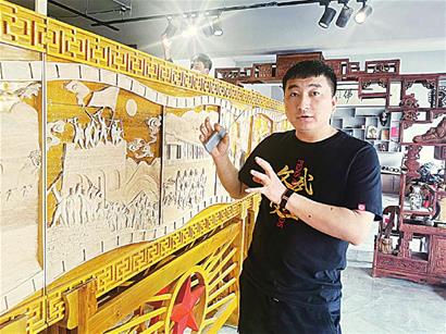 近年來,李寶峰大膽嘗試,在傳統(tǒng)木雕作品的基礎(chǔ)上不斷創(chuàng)新,懷著對黨的感恩和對家鄉(xiāng)的熱愛,不斷將作品注入紅色元素,積極探索設(shè)計(jì)創(chuàng)作具有時代氣息的木雕作品,用刀木刻畫春秋、記錄時代變遷。