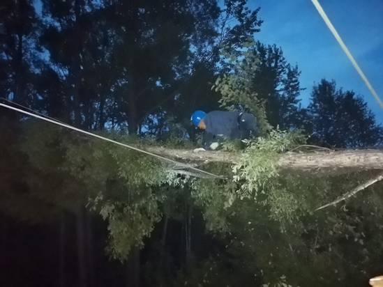 飛機(jī)巡查發(fā)現(xiàn)的呼碧線128號電線桿和129號電線桿之間線路故障處,由呼中輸電運(yùn)檢班組負(fù)責(zé)搶修,需搶修人員步行穿過密林和水道,經(jīng)過1個(gè)多小時(shí)的艱難跋涉方能到達(dá),現(xiàn)場電線上掛著一棵直徑40多厘米的風(fēng)倒樹,導(dǎo)致電線破損,搶修人員將風(fēng)倒樹用手鋸切割移除,并對破損電線進(jìn)行補(bǔ)強(qiáng),截至21時(shí)30分,呼碧線兩處故障全部搶修完畢,呼中區(qū)陸續(xù)完成供電。