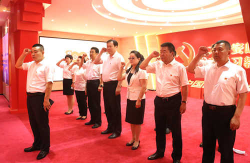 在地區(qū)黨史學(xué)習(xí)教育展館,面對鮮紅的黨旗,新林區(qū)委書記領(lǐng)誓,區(qū)委理論學(xué)習(xí)中心組成員集體宣誓,重溫入黨誓詞,砥礪前進初心,勇?lián)氊熓姑?/span>