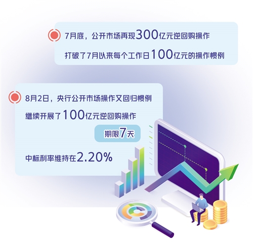 7月底,公開(kāi)市場(chǎng)再現(xiàn)300億元逆回購(gòu)操作,打破了7月以來(lái)每個(gè)工作日100億元的操作慣例。7月29日、30日,中國(guó)人民銀行連續(xù)發(fā)公告稱,為維護(hù)月末流動(dòng)性平穩(wěn),以利率招標(biāo)方式開(kāi)展了300億元逆回購(gòu)操作,期限7天,中標(biāo)利率維持在2.20%不變。