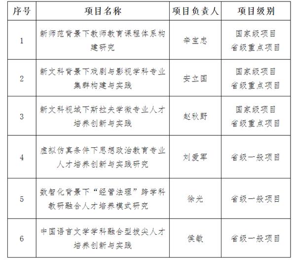 截止至8月5日,教育部首批新文科研究與改革實踐項目立項名單公示期結束,哈爾濱師范大學3項省級重點項目全部獲批國家級立項,在省內(nèi)高校中名列前茅。這3項國家級項目分別是:辛寶忠教授主持的教育學領域新文科建設實踐項目《新師范背景下教師教育課程體系構建研究》、安立國教授主持的藝術字領域新文科建設實踐項目《新文科背景下戲劇與影視學科專業(yè)集群構建與實踐》、趙秋野教授主持的新文科復合型人才培養(yǎng)創(chuàng)新與實踐項目《新文科視域下斯拉夫?qū)W微專業(yè)人才培養(yǎng)創(chuàng)新與實踐》。