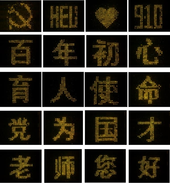 黨徽、HEU(哈工程縮寫)、愛心、9.10、百年初心、育人使命、為黨育人、為國(guó)育才、老師您好……同學(xué)們匯聚力量共同拼出了24組圖案和字樣,即使天空飄起毛毛細(xì)雨,他們也絲毫沒有變換位置,在雨中足足站了兩個(gè)小時(shí)。2021級(jí)博士生王文軒感慨:“作為一名本、碩都就讀于哈工程的學(xué)生,這所大學(xué)的老師教會(huì)了我如何做人做事做學(xué)問,我們用這場(chǎng)燈光秀,獻(xiàn)禮我們最尊敬的老師,我們也一定會(huì)傳承哈軍工精神,勇?lián)鷱?qiáng)國(guó)百年使命擔(dān)當(dāng)。”