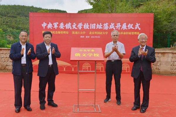 延安革命紀(jì)念地管理局黨委書記薛耀軍、黑龍江大學(xué)黨委書記王永清、北京外國(guó)語大學(xué)校友總會(huì)會(huì)長(zhǎng)楊學(xué)義工、中央軍委俄文學(xué)校校長(zhǎng)曾涌泉之子曾建為中央軍委俄文學(xué)校舊址展覽揭牌。