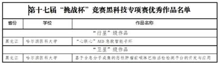 黑龍江經(jīng)濟(jì)網(wǎng)訊(黑龍江日?qǐng)?bào)全媒體見(jiàn)習(xí)記者董廣碩 商祺)近日,第十七屆“挑戰(zhàn)杯”全國(guó)大學(xué)生課外學(xué)術(shù)科技作品競(jìng)賽落下帷幕,哈爾濱醫(yī)科大學(xué)附屬二院團(tuán)隊(duì)《“心聯(lián)心”AED急救智能手環(huán)》和哈醫(yī)大附屬腫瘤醫(yī)院團(tuán)隊(duì)《基于全息分子成像系統(tǒng)的惡性腫瘤前哨淋巴結(jié)活檢檢測(cè)平臺(tái)的開(kāi)發(fā)與應(yīng)用》兩個(gè)作品在“黑科技”專(zhuān)項(xiàng)賽終審決賽中,分別榮獲“行星級(jí)”和“衛(wèi)星級(jí)”稱(chēng)號(hào)。