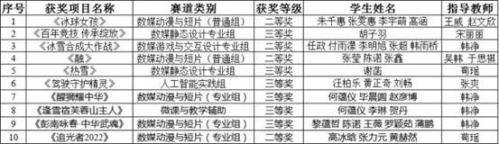 在參賽學生與指導教師的共同努力下,10項作品進入國賽(包括大數(shù)據(jù)應用組、人工智能實踐組、數(shù)媒動漫與短片組、數(shù)媒靜態(tài)設計專業(yè)組、微課與教學輔助組、數(shù)媒游戲與交互設計組),最終喜獲全國二等獎4項,全國三等獎6項。