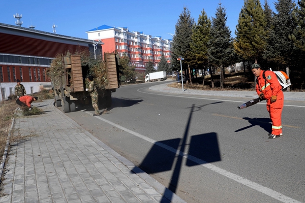 圖為阿木爾林業(yè)局森林消防大隊(duì)專業(yè)撲火隊(duì)員利用風(fēng)力滅火機(jī)將林海路路面上的碎石塵埃清除干凈(王力/攝)