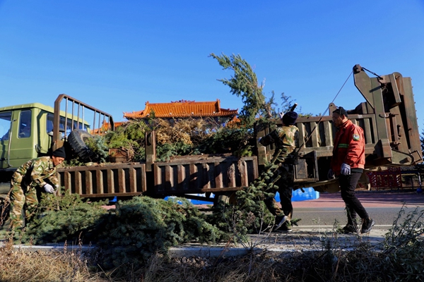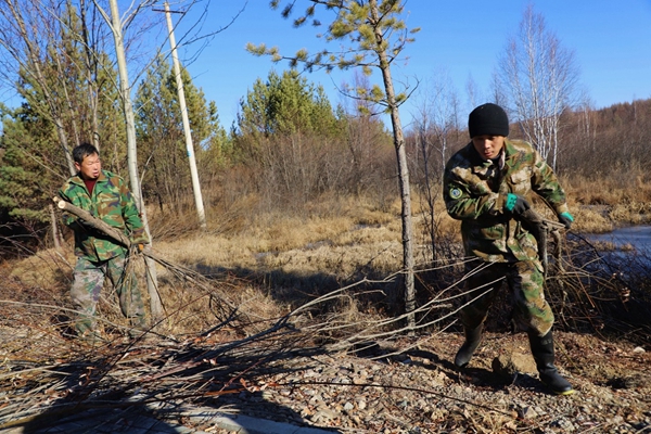 圖為阿木爾林業(yè)局森林消防大隊(duì)專業(yè)撲火隊(duì)員將修剪下來(lái)的樹(shù)枝裝車(chē)運(yùn)走(王力/攝)