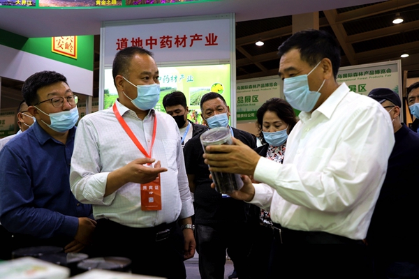 阿木爾林業(yè)局黨委書記胡守慶(右一)查看參展產品質量情況(王力/攝)