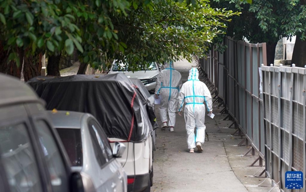 11月4日,在重慶九龍坡區(qū)九龍街道,兩名身穿防護服的青年志愿者走向自己負責的樓棟。