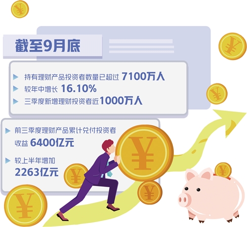 而且,隨著居民財(cái)富的不斷積累,投資者的理財(cái)意識(shí)顯著增強(qiáng),銀行理財(cái)投資者人數(shù)持續(xù)增長(zhǎng),截至9月底,持有理財(cái)產(chǎn)品投資者數(shù)量已超過7100萬人,較年中增長(zhǎng)16.10%,僅三季度新增理財(cái)投資者近1000萬人。在轉(zhuǎn)型過程中,理財(cái)產(chǎn)品的投資收益也穩(wěn)中有升,前三季度理財(cái)產(chǎn)品累計(jì)兌付投資者收益6400億元,較上半年增加2263億元。