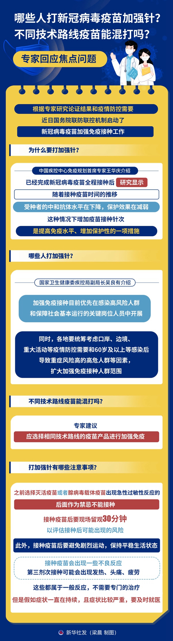 關(guān)于去哪里打加強(qiáng)針,問答指出,原則上感染高風(fēng)險(xiǎn)人群和保障社會基本運(yùn)行的關(guān)鍵崗位人員加強(qiáng)免疫接種由各相關(guān)單位統(tǒng)一組織實(shí)施;其他人群可到轄區(qū)指定的接種單位進(jìn)行預(yù)約接種。各地具體接種信息見當(dāng)?shù)匦l(wèi)生健康部門或疾控中心發(fā)布的官方信息。
