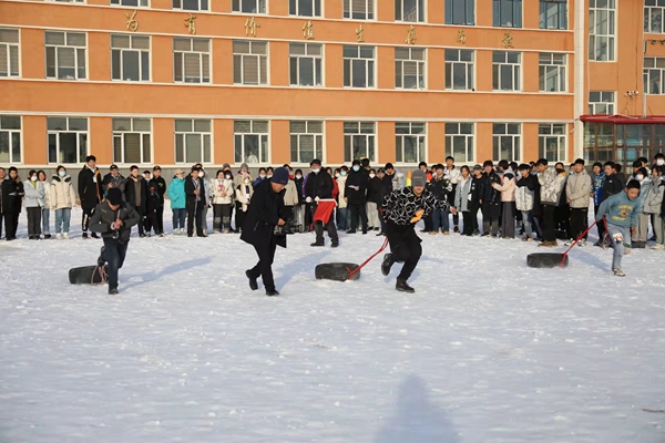組織開展拉輪胎跑比賽。拉輪胎跑比賽在各年級間進行,每班6名選手,50米往返,以時間少者為勝。隨著裁判老師一聲令下,比賽開始,選手們立馬拉起了輪胎奮力向前沖刺,克服雪地不利的條件,參賽選手飛快地向終點奔跑,掌聲、加油聲響徹操場。冬日的操場上,一個個