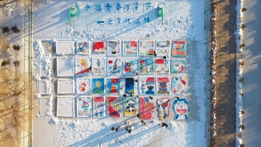雪后的籃球場,變身為學(xué)生們的巨型畫板,大家在這里以“迎接建黨100周年”、“迎接北京2022冬奧會”為主題,在雪地上涂鴉,把雪后的校園裝扮得與眾不同。學(xué)生們發(fā)揮想象,用色彩描繪出更快、更高、更強的奧林匹克精神,以涂鴉展現(xiàn)著當(dāng)代中學(xué)生的青春風(fēng)采。