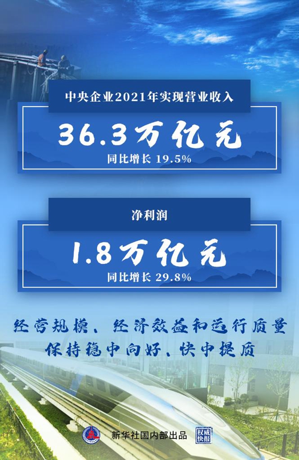 2021年,中央企業(yè)完成固定資產(chǎn)投資(不含房地產(chǎn))3.2萬(wàn)億元,同比增長(zhǎng)10.1%;上繳稅費(fèi)2.4萬(wàn)億元,同比增長(zhǎng)20%;截至去年末中央企業(yè)資產(chǎn)負(fù)債率保持在64.9%,圓滿(mǎn)完成預(yù)期目標(biāo)。