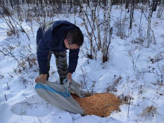 呼中林業(yè)局森林資源管理科工作人員山間為野生動物投放食物(劉玉龍 攝)