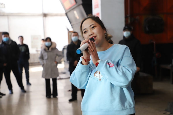 阿木爾林業(yè)局文藝輕騎兵小分隊隊員張春雨為物業(yè)公司集中供熱一車間司爐工演唱歌曲《又見山里紅》(王力 攝)