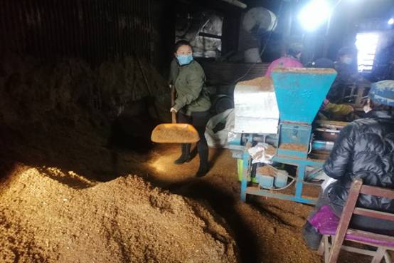新林林業(yè)局塔源林場黨員志愿者幫助黑木耳養(yǎng)殖戶做菌上料(董淑玲 攝)