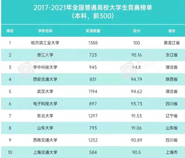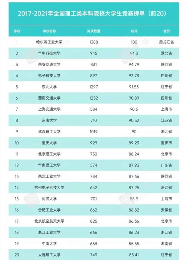 黑龍江經(jīng)濟網(wǎng)訊(黑龍江日報全媒體見習(xí)記者董廣碩 商祺)近日,中國高等教育學(xué)會高校競賽評估與管理體系研究工作組發(fā)布2021全國普通高校大學(xué)生競賽分析報告,全國共有1197所本科院校進入2017—2021年本科榜單。哈爾濱工業(yè)大學(xué)以獲獎數(shù)量1388項、總分100分獲得2017—2021年全國普通高校大學(xué)生競賽榜單榜首,以獲獎數(shù)量639項、總分100分獲得2021年全國普通高校大學(xué)生競賽榜單榜首。這是哈爾濱工業(yè)大學(xué)連續(xù)3次獲得上述榜單冠軍。