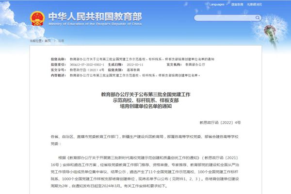 根據(jù)《教育部辦公廳關(guān)于開展第三批新時(shí)代高校黨建示范創(chuàng)建和質(zhì)量創(chuàng)優(yōu)工作的通知》(教思政廳函〔2021〕16號(hào))安排,經(jīng)省級(jí)黨委教育工作部門推薦、專家評審等環(huán)節(jié),教育部遴選產(chǎn)生了11個(gè)全國黨建工作示范高校、100個(gè)全國黨建工作標(biāo)桿院系、1000個(gè)全國黨建工作樣板支部培育創(chuàng)建單位。各培育創(chuàng)建單位建設(shè)周期為2年,自通知發(fā)布日起至2024年3月。