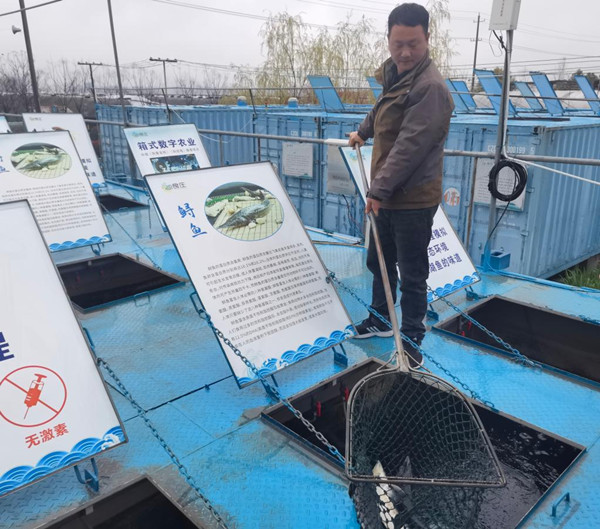 在良莊農(nóng)業(yè)科技園里,一排排藍色集裝箱,以及寫著“養(yǎng)殖箱體全程模擬自然生態(tài)環(huán)境,還您江湖魚的味道”等字樣的標(biāo)牌,別有一番趣味。記者了解到,這里是一個智慧漁場,裝滿水的集裝箱則是鱘魚、鱸魚、鯽魚等的“家園”,打開一個集裝箱的頂部,三五成群的魚兒在約15平方米的水里游來游去。