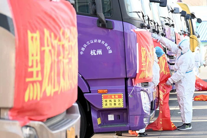 為了保障此次物資運(yùn)送順利、安全,所有車輛及人員全部實(shí)行閉環(huán)管理,途中不經(jīng)過市區(qū),安排警車引導(dǎo),運(yùn)送物資車輛原則上直接抵達(dá)吉林省外接卸點(diǎn),不與吉林省工作人員直接接觸,無接觸傳遞完成物資交接后,立即對車輛進(jìn)行全面消毒。