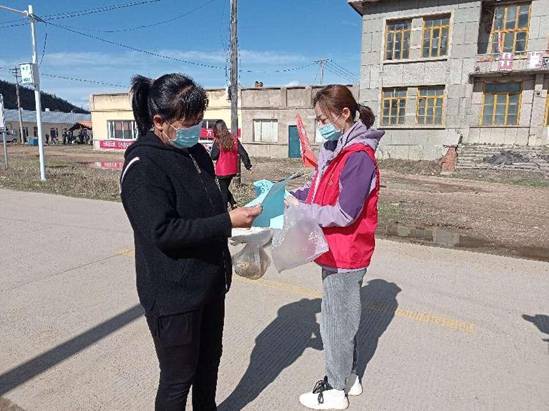 新林林業(yè)局大烏蘇林場“林海流星雨”志愿服務隊隊員在向居民發(fā)放防火宣傳單(劉志剛 攝)