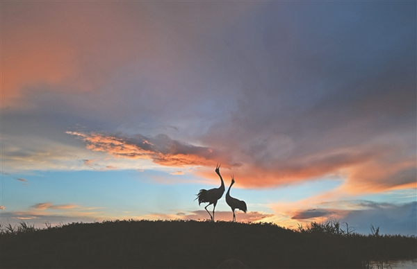 6月,齊齊哈爾市東南26公里處,湖澤密布,葦草叢生,滿目蔥蘢,一群丹頂鶴在天空中展翅翱翔、九霄長(zhǎng)鳴。每年6月~8月,是齊齊哈爾扎龍濕地最美麗的時(shí)節(jié)。傍晚,迎著晚霞,曲項(xiàng)向天,引吭高歌,一幅美麗的山水畫卷盡收眼底。