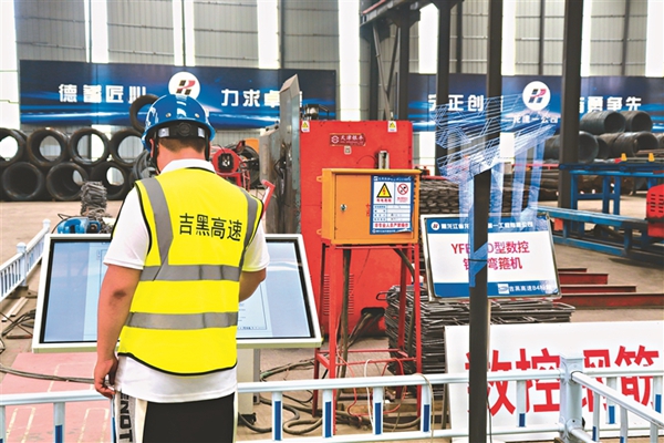 鋼筋加工車間里一處3D立體投影,讓工人們可以直觀看到自己加工后的構(gòu)件將用于整體鋼筋骨架的哪個(gè)部位。任書(shū)法說(shuō),吉黑高速項(xiàng)目打造智慧梁廠,采用了數(shù)控鋼筋滾焊機(jī)、數(shù)控鋼筋剪切生產(chǎn)線、數(shù)控鋼筋彎曲中心+自動(dòng)上料配套等設(shè)備,以前這么大的加工廠要30多人,現(xiàn)在只需一半的人力,就能干出兩倍的工作量,極大提高了施工精度和效率。