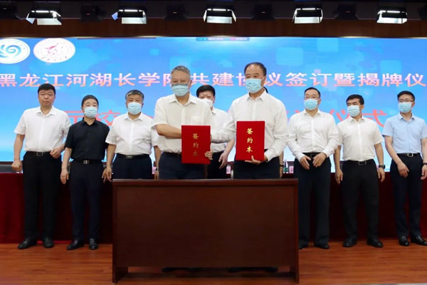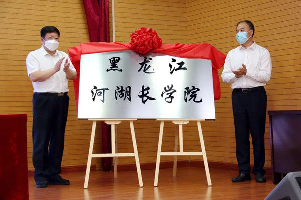 儀式上,省水利廳黨組書記、廳長、省河湖長制辦公室常務副主任侯百君和黑龍江大學校長付宏剛簽訂了共建協(xié)議,與黑龍江大學黨委書記王永清共同為黑龍江河湖長學院揭牌。