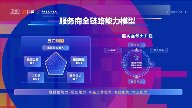 快手電商服務(wù)商則介紹了服務(wù)商全鏈路能力模型。針對商家主播能力弱、私域流量差、貨品不健全、投流ROI難提升等痛點(diǎn),服務(wù)商可以發(fā)揮流量營銷、直播運(yùn)營、主播孵化、供應(yīng)鏈、服務(wù)履約等全鏈路能力,助力商家冷啟孵化和躍遷。自今年3月底常熟服飾產(chǎn)業(yè)帶落地至今,快手服務(wù)商已服務(wù)500多個(gè)常熟商家,常熟當(dāng)?shù)乜焓謩?dòng)銷商家數(shù)提升30%+。