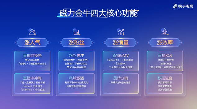 本次活動(dòng),快手磁力金牛和快手電商服務(wù)商也宣布推出一系列政策,推動(dòng)常熟女裝商家電商生意增長。作為電商生意的加速器,快手磁力金牛讓商家投流更精準(zhǔn)、效率更高、效果更好。在賬號(hào)啟動(dòng)期,商家可借助磁力金牛進(jìn)行私域起量,并根據(jù)貨盤制定營銷策略;在賬號(hào)成長期,商家可依據(jù)S-A-B直播策略模型,使用磁力金牛進(jìn)行差異化投流、精細(xì)化運(yùn)營;在賬號(hào)成熟期,磁力金??梢栽谄沸f(xié)同下進(jìn)行差異化拓客,引入新流量。