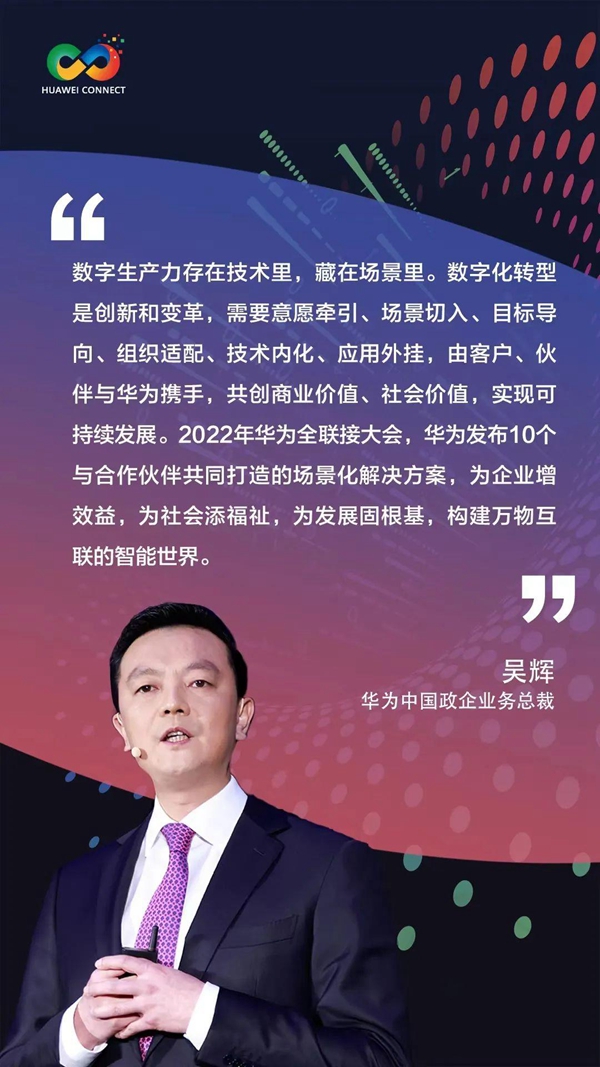 當(dāng)前,我國的數(shù)字化已經(jīng)進(jìn)入快車道,釋放數(shù)字生產(chǎn)力正當(dāng)其時。而“數(shù)字生產(chǎn)力就存在技術(shù)里,藏在場景里?!被诖?,華為中國政企業(yè)務(wù)總裁吳輝在會上發(fā)表了題為《為行業(yè)找技術(shù),深入場景創(chuàng)造價值》的主題演講,重點(diǎn)分享了華為基于多年的探索和實(shí)踐總結(jié)出的行業(yè)數(shù)字化轉(zhuǎn)型的方法論和企業(yè)轉(zhuǎn)型成功秘訣。