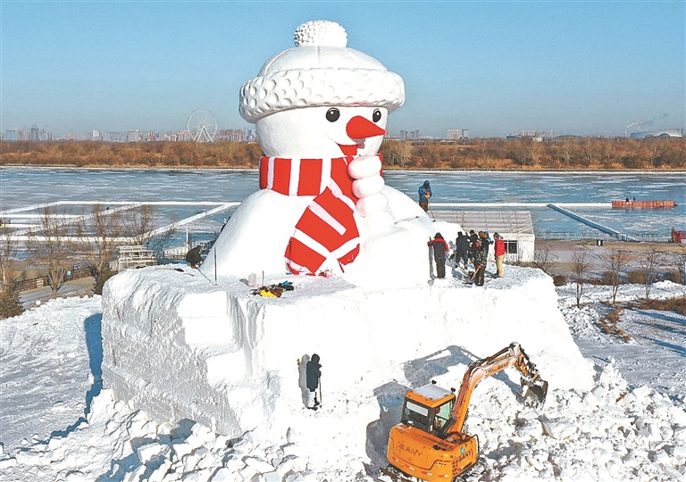 12月7日,哈爾濱市道里區(qū)群力江畔,一座巨型雪人已基本制做完成,工人在進行收尾工作。雪人近20米高,黑眼睛,紅鼻子,戴著紅圍巾和白絨帽,手里拿著一大串糖葫蘆,笑容可掬,十分可愛。本報記者 蘇強攝
