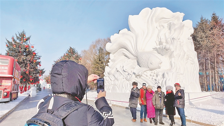 游人在雪雕前合影。本報(bào)記者 蔣國(guó)紅攝