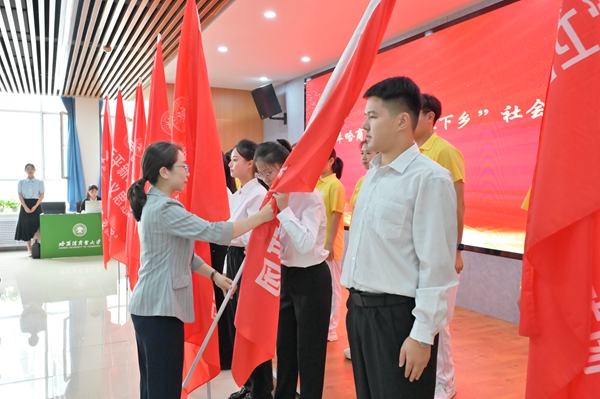 省希望工程捐助中心主任、省青少年發(fā)展基金會理事長杜晶為哈爾濱商業(yè)大學2024年“三下鄉(xiāng)”社會實踐團隊代表、“情暖童心·鄉(xiāng)伴童行”支教團代表授旗,希望即將奔赴龍江大地的志愿者們能夠充分利用服務期,向下扎根、向上生長,踐行志愿服務精神,在奉獻與收獲中積累報國為民的樸素情懷,做有理想、有擔當?shù)男聲r代青年。