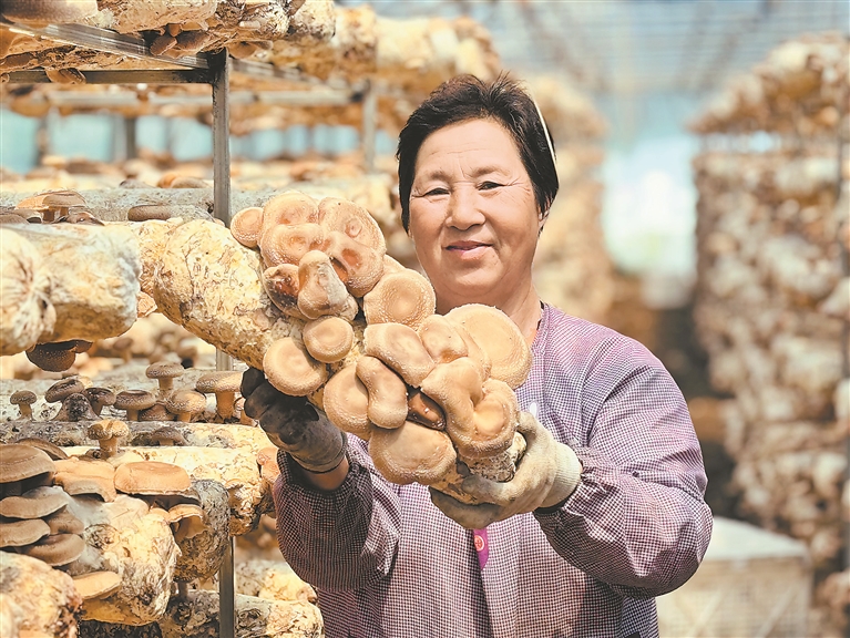 陽光透過棚室,溫熱的空氣中彌漫著花菇特有的香氣。一根根整齊擺放的菌棒上,淡褐色的花菇簇擁而生,“傘面”花紋爆開,煥發(fā)著勃勃生機?!耙粭澑邩藴蚀笈锓胖靡蝗f根菌棒,每年生長季可以采收六至七茬,一棟大棚至少收獲2萬斤花菇,按市場價7元一斤算,產(chǎn)值就是14萬元?!必撠熁ü缴a(chǎn)技術(shù)管理的趙景龍說起花菇種植的“錢景”,一臉笑意。