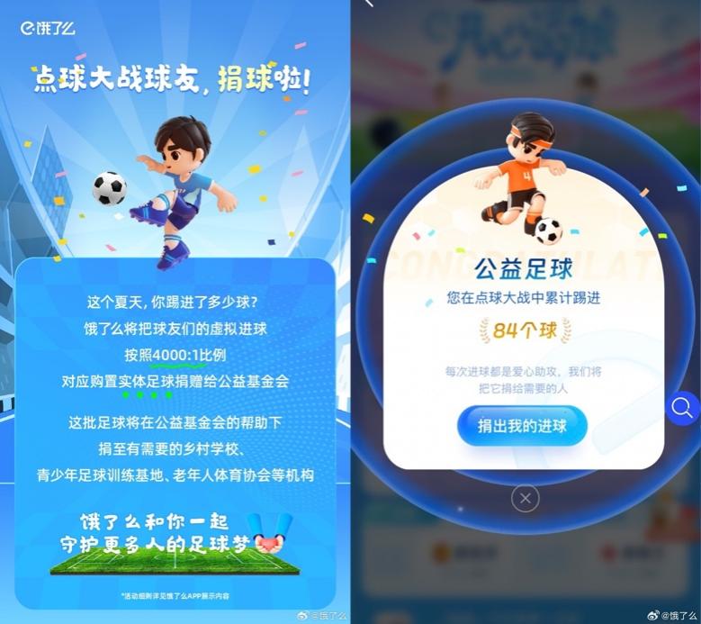 在西班牙隊球迷的歡呼聲中歐洲杯正式落幕,隨之結束的還有餓了么足球季活動。7月15日當天,餓了么官宣上線足球捐贈活動,所有用戶都可以選擇捐贈這一個月來在“點球大戰(zhàn)”游戲中累積的虛擬進球,餓了么將聯(lián)合公益基金會,按照比例對應捐贈實物足球給到有需要的鄉(xiāng)村學校、青少年足球訓練基地、老年人體育協(xié)會等,和用戶一起把今夏開心傳遞給更多人。
