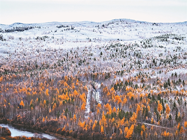 從空中俯瞰最北邊城儼然已經(jīng)進入冬季。眼下正值漠河的金秋時節(jié),突如其來的降雪為北國秋色增添了別樣美景。松枝上布滿了厚厚的雪球,山林之間的秋色景觀與皚皚白雪同框,火車在白雪森林間穿行而過,令南方游客驚嘆不已。本報記者 張磊攝