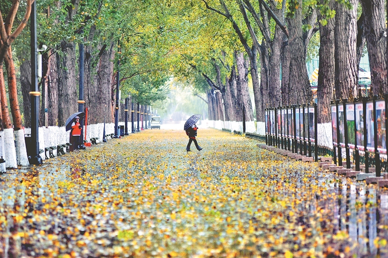 雨中秋意濃。10日一場秋雨,哈爾濱街道兩側的樹葉紛紛飄落,滿地落葉如同一層金色地毯,為秋日冰城增添了更多魅力。外出的人們撐起五顏六色的雨傘,走在落葉間,構成了一幅幅美麗的油畫。