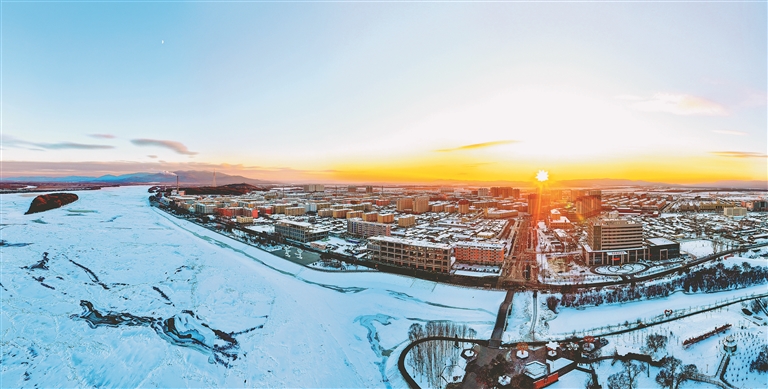 夕陽(yáng)下的烏蘇里江和饒河縣城。戰(zhàn)志遠(yuǎn)攝