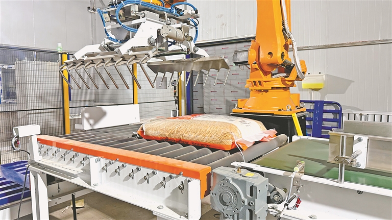 楊旭升介紹:“我們基地今年新增加全自動(dòng)封袋機(jī)、全自動(dòng)機(jī)械手臂,實(shí)現(xiàn)全自動(dòng)封袋包裝、碼垛功能,也可實(shí)現(xiàn)24小時(shí)不間斷加工作業(yè),提高種子加工速度的同時(shí),大大節(jié)省勞動(dòng)力,節(jié)省空間,提高生產(chǎn)效率?!?/p>