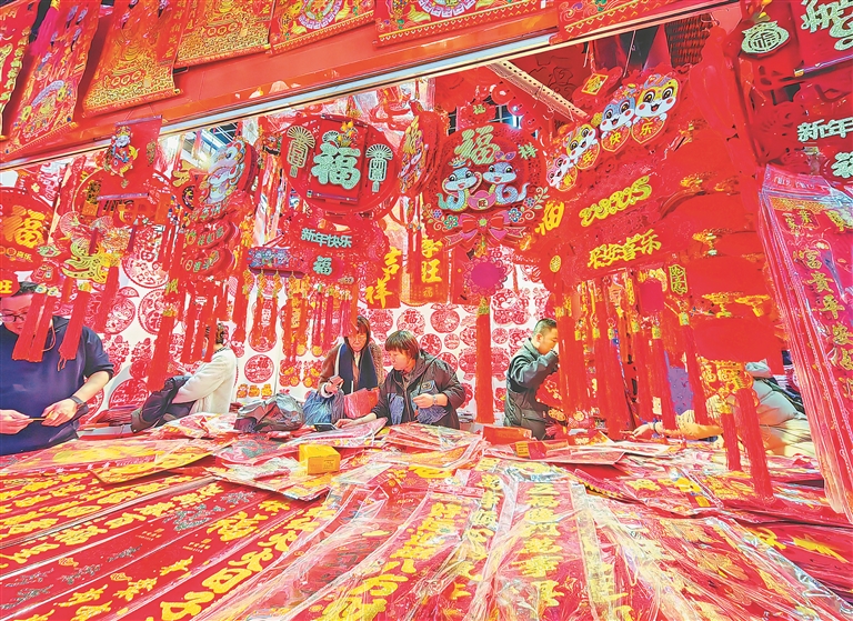 春節(jié)臨近,哈爾濱市道里區(qū)一處批發(fā)市場(chǎng)內(nèi),市民們正在購買各種節(jié)日飾品,用來裝點(diǎn)家居,迎接新春佳節(jié)的到來。蛇年主題的燈籠、對(duì)聯(lián)、福字等擺滿了柜臺(tái),紅紅火火,喜慶氣氛濃厚。人們臉上都洋溢著幸福的笑容,一邊逛一邊買,個(gè)個(gè)滿載而歸。
