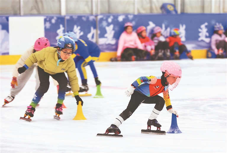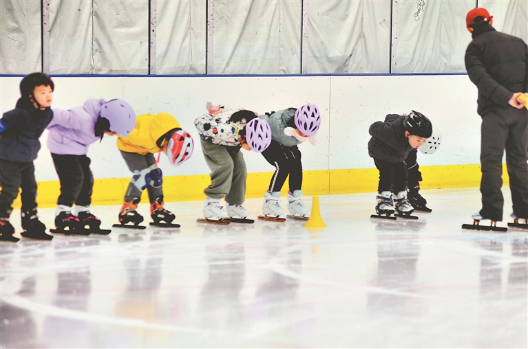 2日,哈爾濱市道里區(qū)冰上運動中心氣膜冰場內,百余名中小學生正在練習滑冰。