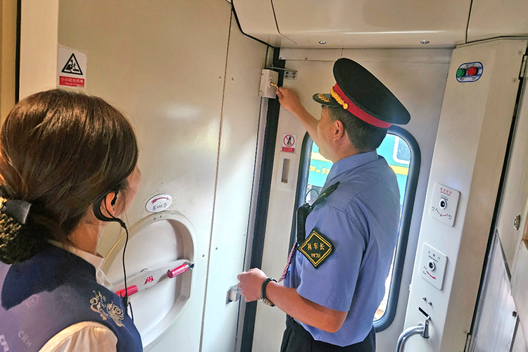 列車長(zhǎng)在對(duì)車門加鎖情況進(jìn)行檢查。(韓峰 攝)