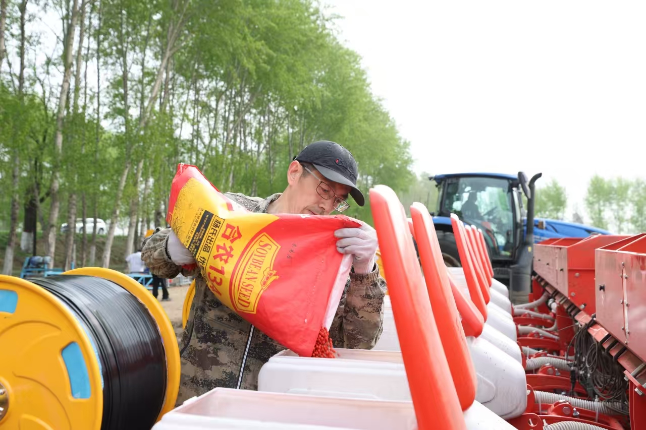 在北林區(qū)大豆大面積單產(chǎn)提升示范區(qū),工作人員熟練地操作著設備,金黃的大豆種子源源不斷地進入拌種機,經(jīng)過與精心調(diào)配的種衣劑充分混合,一顆顆種子都披上了一層均勻的“防護衣”,為大豆高產(chǎn)穩(wěn)產(chǎn)和黑土地保護注入新動能。
