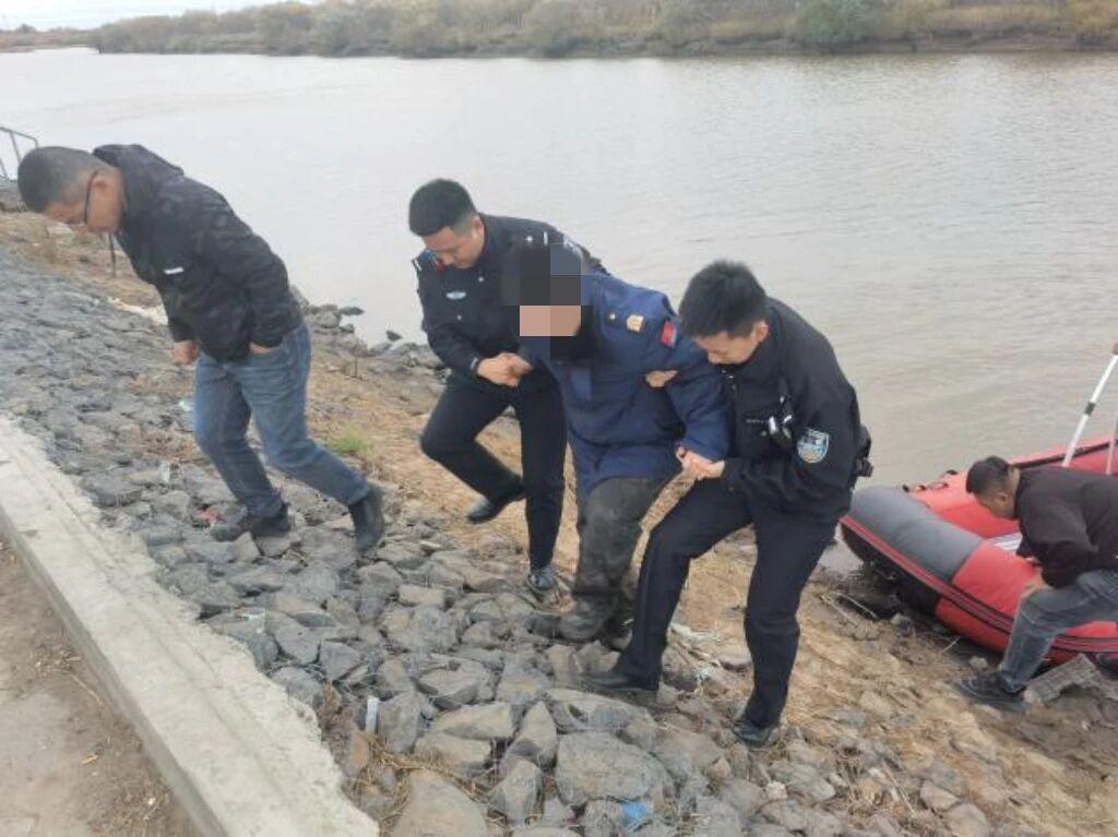 由于男子距離岸邊較遠(yuǎn),徒手救援難度極大。民警第一時(shí)間聯(lián)系情報(bào)指揮中心請(qǐng)求支援,同時(shí)聯(lián)動(dòng)五大連池市應(yīng)急管理局,同步告知現(xiàn)場(chǎng)情況,協(xié)助做好救援準(zhǔn)備。在等待救援的間隙,民警始終趴在橋邊呼喊,持續(xù)與男子對(duì)話,穩(wěn)定該男子情緒。很快,救援力量抵達(dá)現(xiàn)場(chǎng)。民輔警立即協(xié)助專業(yè)救援人員駕上皮筏艇,快速向男子被困位置靠近。留在岸邊的民輔警則繼續(xù)喊話安撫,引導(dǎo)男子保持清醒,配合救援。共同協(xié)作下,男子被成功轉(zhuǎn)移至岸邊,民輔警合力將其拉上岸。上岸后,男子全身濕透、身體發(fā)抖,民輔警迅速將其扶上警車取暖。