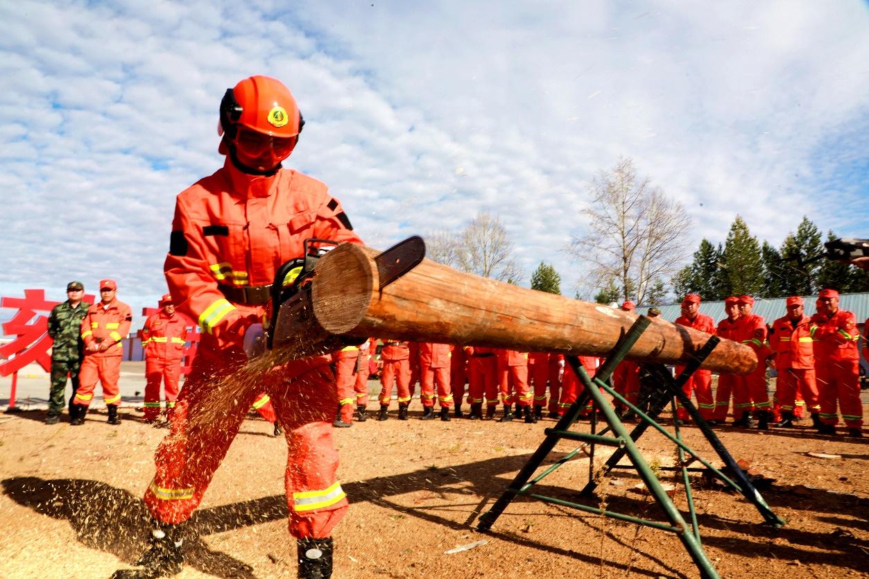 阿木爾林業(yè)局撲火專業(yè)隊員在進(jìn)行油鋸割木競賽(王力 攝)