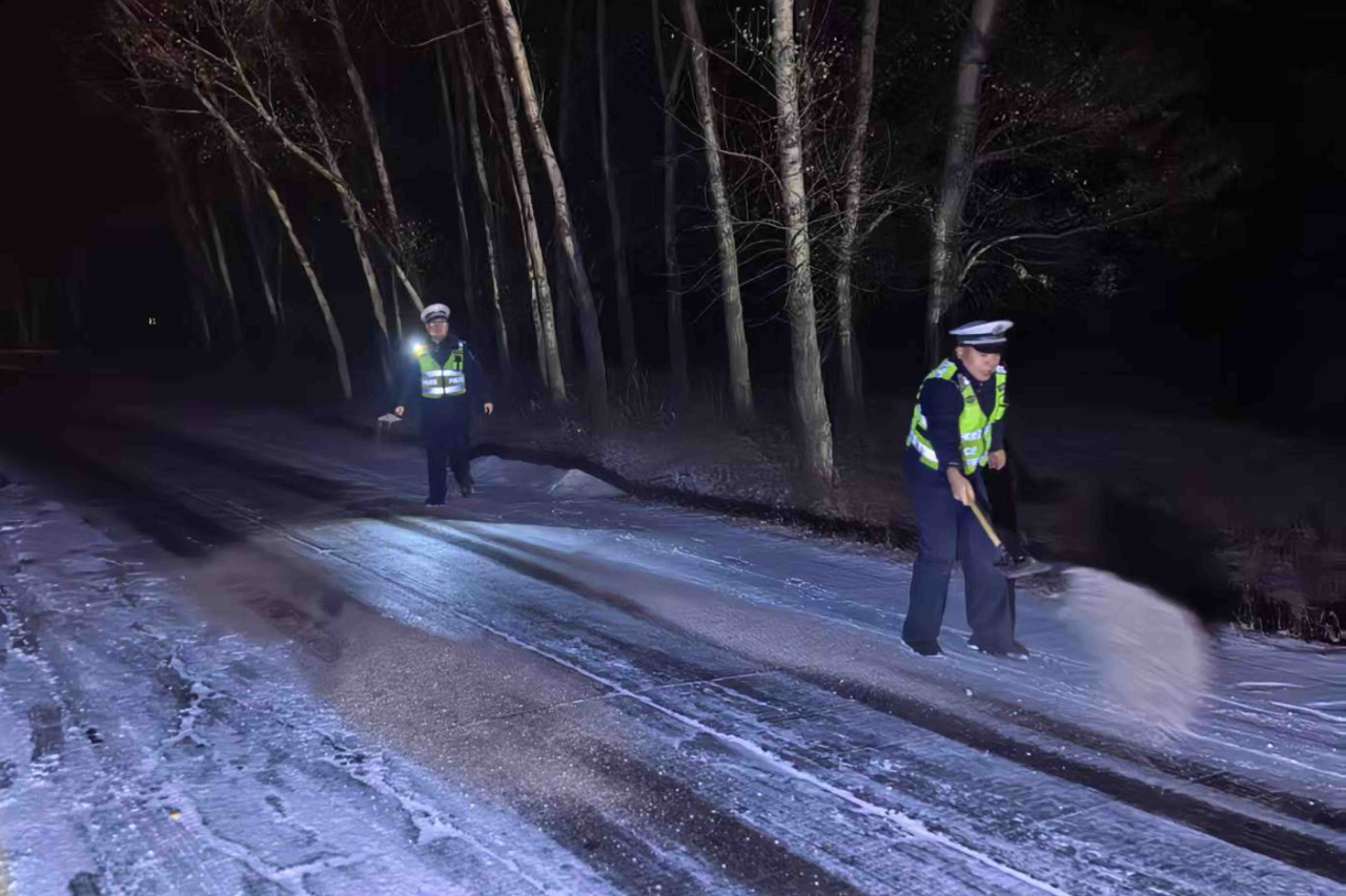 工作中,民輔警重點(diǎn)對(duì)坡道、彎道、橋梁等易結(jié)冰路段進(jìn)行巡查,針對(duì)國(guó)道坡度較大、彎道較多、易滑的結(jié)冰路段,采用“定點(diǎn)潑灑+動(dòng)態(tài)巡邏補(bǔ)撒”的方式,使用鐵鍬、掃帚等工具,向結(jié)冰路面均勻潑灑工業(yè)鹽、撒布防滑沙等防滑料,進(jìn)一步增強(qiáng)路面摩擦力,防止車輛打滑,確保路面盡快恢復(fù)安全通行條件,有效遏制交通事故的發(fā)生,全力保障群眾出行安全。同時(shí),民輔警采取定點(diǎn)執(zhí)勤與流動(dòng)巡邏相結(jié)合的方式,加強(qiáng)路面巡邏管控和指揮疏導(dǎo),利用喊話器積極提醒過往車輛保持安全車距,減速慢行,謹(jǐn)慎駕駛,確保行車安全。