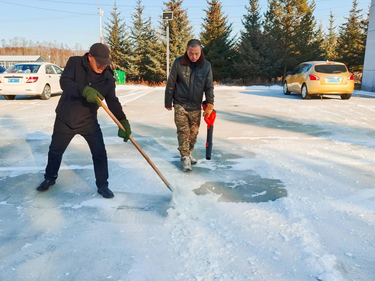 林場(chǎng)職工清理廣場(chǎng)積雪(李婷 攝)